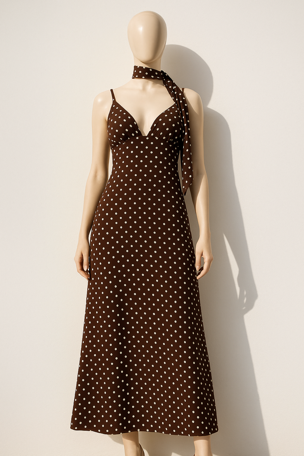 Este vestido marrón con lunares blancos, largo y elegante es perfecto para cualquier ocasión.